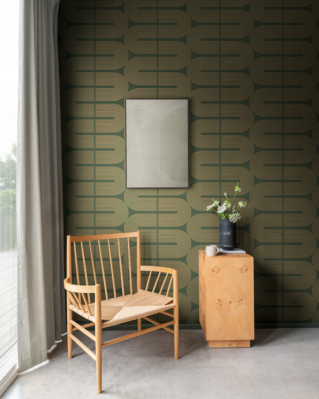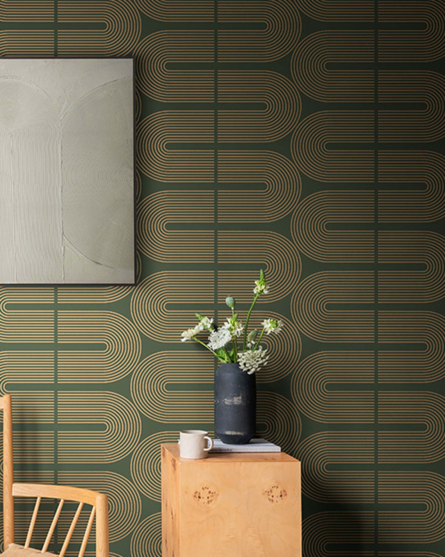Breng architecturale elegantie in je interieur met het Barcelona 32115 behang van Dutch First Class. Op een diep groene achtergrond ontvouwen zich grafische bogen in een subtiel spel van lijnen en ruimte. Horizontale koperkleurige lijnen volgen zachte curves die doen denken aan de schaduwen van oude gewelven, waardoor een rustige, ritmische flow ontstaat.