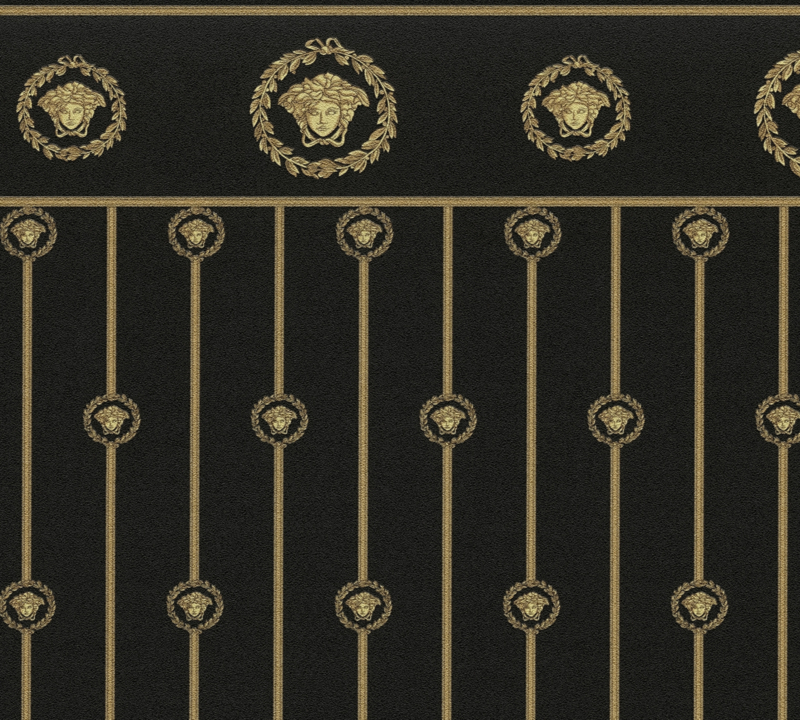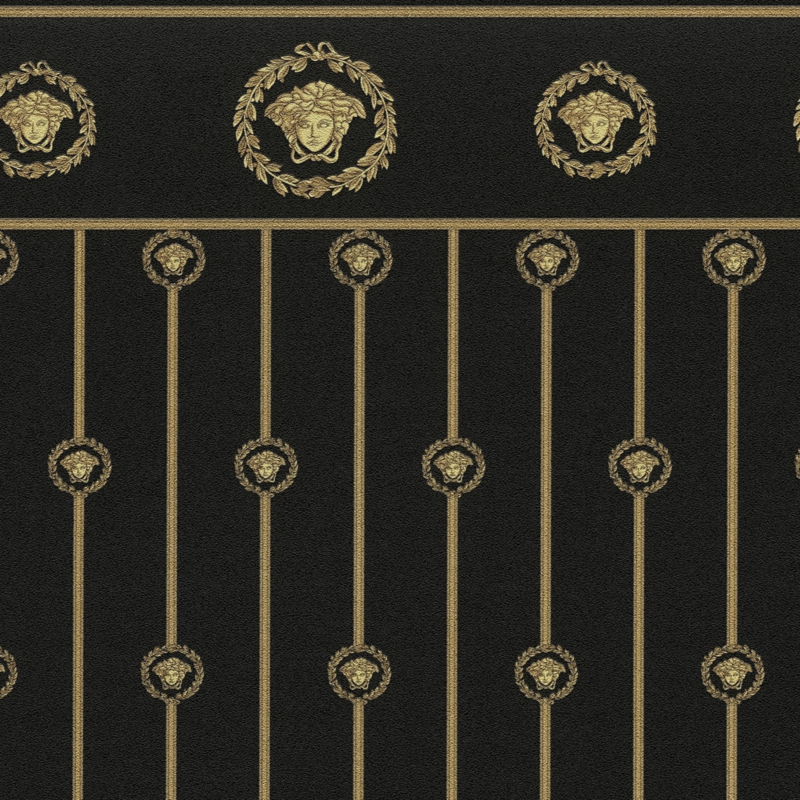 Geef je interieur een krachtige en luxueuze uitstraling met het 79131-2 lambrisering behang uit de exclusieve Versace Home VI collectie. Dit opvallende ontwerp combineert een diepe zwarte basis met goudkleurige Medusa-decoraties en verfijnde ornamentdetails, afgewerkt met een subtiele glans voor een elegant en dynamisch effect.