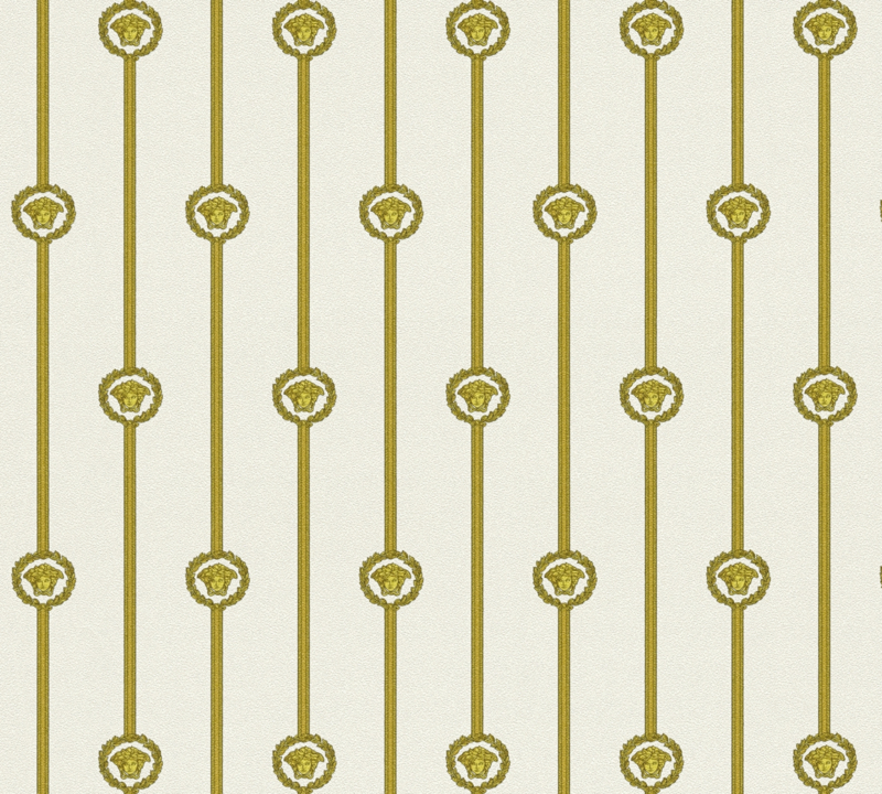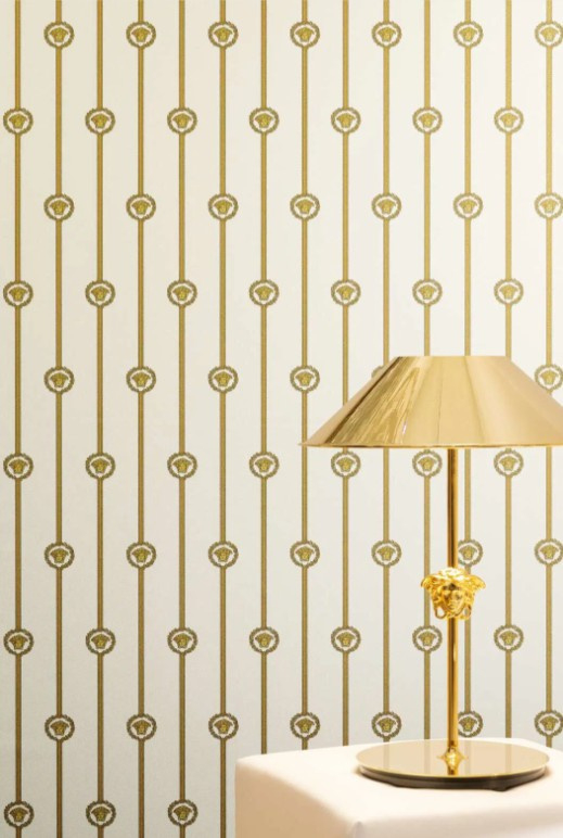 De iconische Medusa-motieven en klassieke medaillonstrepen zorgen voor een harmonieus ritme en geven de wand een rijke, decoratieve uitstraling. Dankzij de lichte glans ontstaat er een speels licht-effect dat diepte en luxe toevoegt zonder te overheersen. Perfect voor woonkamers, slaapkamers of representatieve ruimtes waar elegantie en karakter samenkomen.