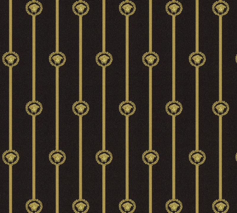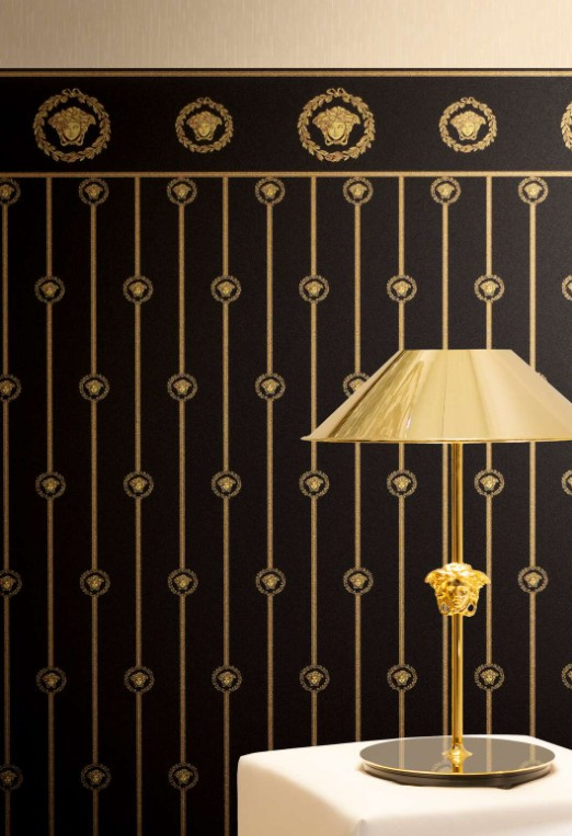 De iconische Medusa-motieven en het ritmische lijnenspel van de medaillonstrepen zorgen voor een dynamisch en elegant geheel. De lichte glans vangt het licht op een verfijnde manier en geeft extra diepte en luxe aan de ruimte. Ideaal voor woonkamers, slaapkamers of high-end projectruimtes waar een uitgesproken en stijlvol statement gewenst is.