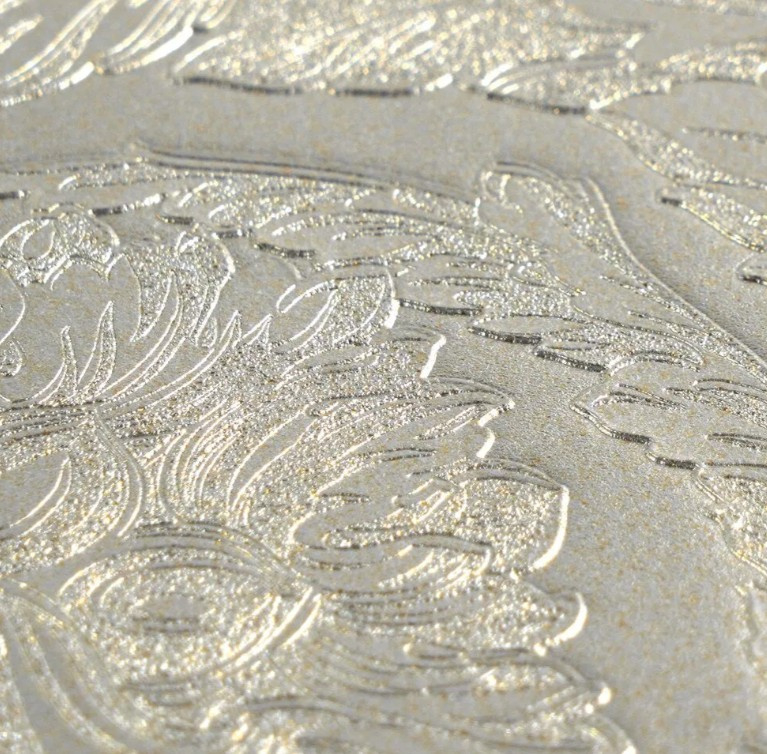 Het zilvergrijs metallic oppervlak voegt een verfijnde glans toe, waardoor het patroon diepte en elegantie krijgt.