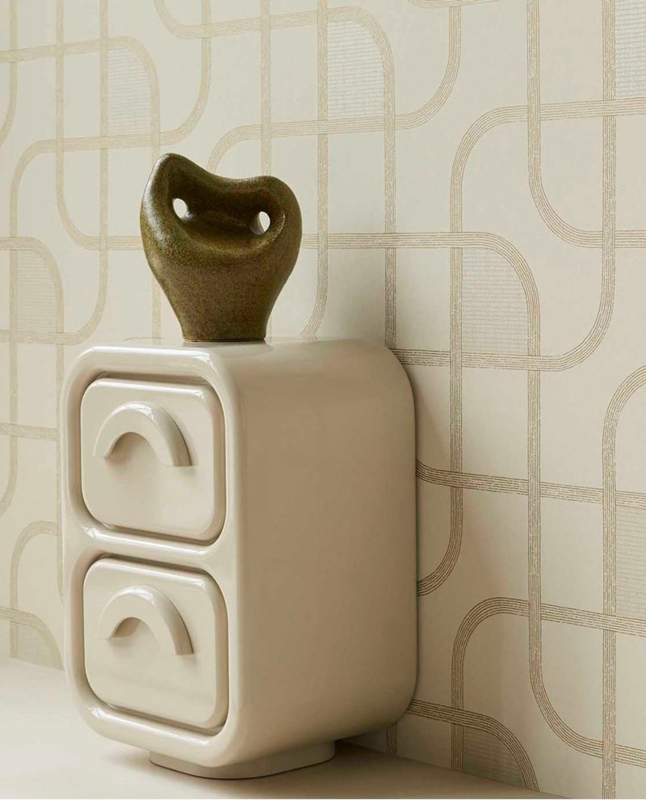 Breng een serene luxe in je interieur met behangpatroon 363262 uit de Calm Crafted collectie van Eijffinger. Dit vliesbehang heeft een elegant grafisch patroon op een zachte groenachtige ondergrond, verrijkt met subtiele gouden accenten die het licht op een verfijnde manier weerkaatsen.