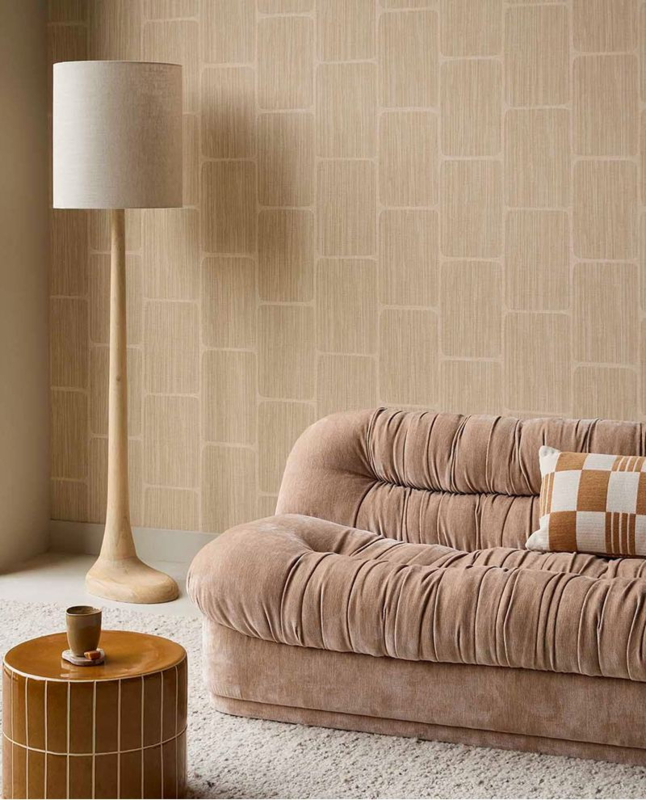De warme beige tint brengt een gevoel van rust en comfort in de ruimte en laat zich moeiteloos combineren met zowel lichte als natuurlijke materialen zoals hout, linnen en wol. Dankzij het subtiele patroon creëer je een rustige wand met net dat beetje extra karakter en diepte, perfect voor een harmonieus interieur.