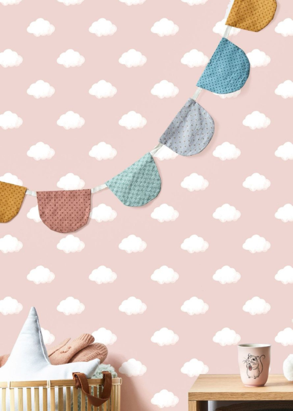 De subtiele wolkjes zorgen voor een luchtig en vriendelijk geheel, zonder dat het druk wordt. De combinatie van wit en roze geeft het behang een zachte en warme uitstraling, perfect voor babykamers en kinderkamers. Het ontwerp laat zich eenvoudig combineren met houten meubels, zachte stoffen en accessoires in neutrale of pastelkleuren.