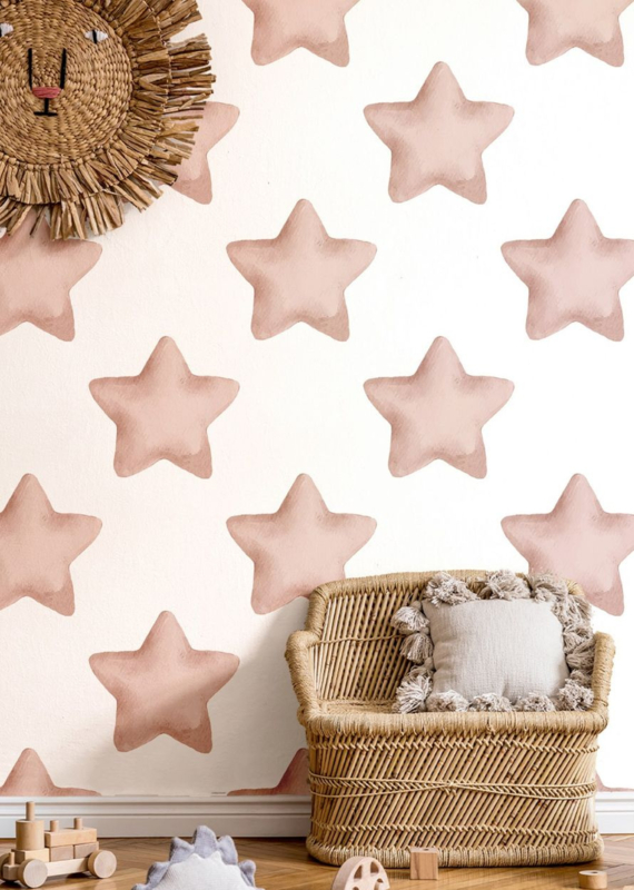 De grote sterren vormen een speels maar kalm geheel en brengen direct een gevoel van warmte en geborgenheid in de ruimte. Door de combinatie van wit en roze oogt het behang zacht, licht en tijdloos. Perfect voor baby- en kinderkamers waarin rust en fantasie samenkomen. De zachte kleuren zorgen voor een harmonieus geheel dat niet snel verveelt.