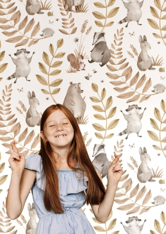 De illustraties van onder andere een das, vos en konijn zorgen voor een levendig maar ingetogen geheel. Dankzij de zachte aquarelstijl en het palet van crème, beige, taupe, bruin en grijs ontstaat een harmonieuze sfeer die perfect past in een kinderkamer, speelruimte of creatieve hoek in huis. Een ontwerp dat fantasie prikkelt zonder te overheersen.