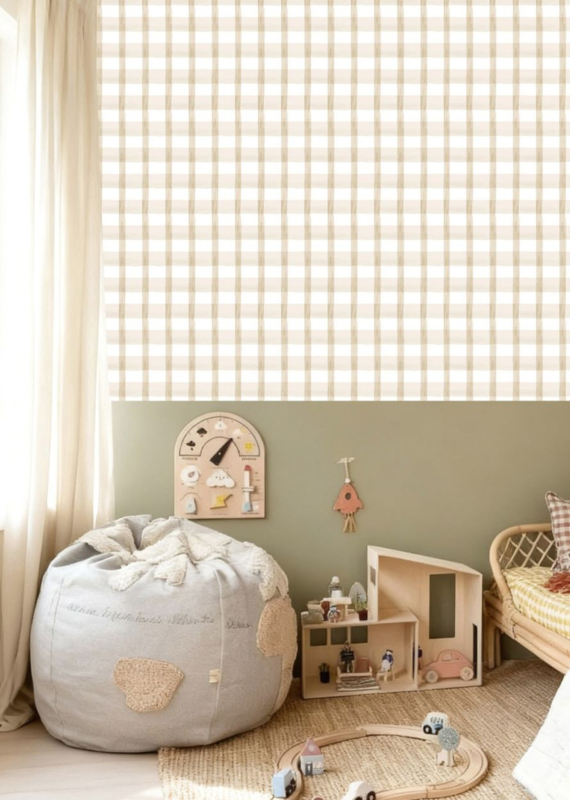 Het subtiele ruitdessin geeft de muur structuur zonder te overheersen en zorgt voor een knusse, gebalanceerde sfeer. Perfect voor de kinderkamer, maar ook prachtig als rustige basis in een moderne woonkamer.