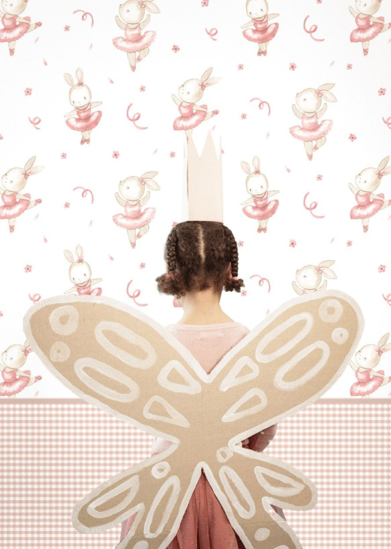 De sierlijke konijntjes zorgen voor een lief en fantasierijk accent op de muur, zonder dat het druk wordt. Dankzij de zachte kleuren blijft het behang perfect in balans en past het moeiteloos in elke kinderkamer met een warme, tijdloze sfeer.