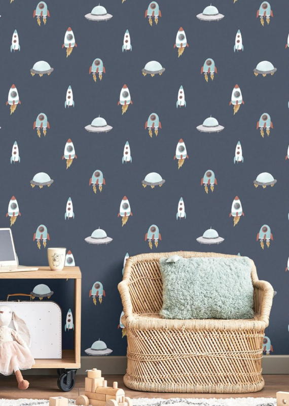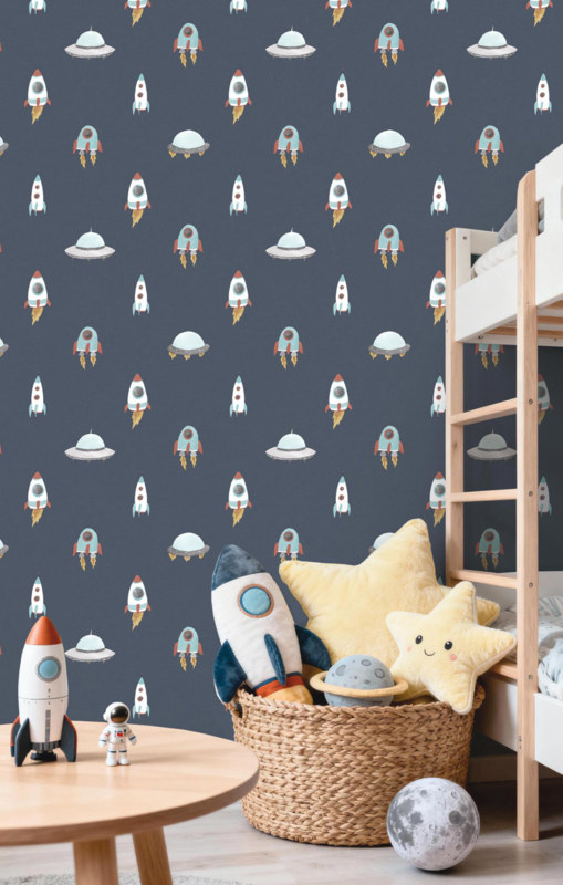 De subtiele patronen doen denken aan bewegende raketten en ruimtevaart, wat zorgt voor een avontuurlijke sfeer die perfect past in een kinderkamer. Dankzij de zachte contrasten blijft het geheel in balans: energiek en fantasierijk, maar toch rustig en harmonieus. Een ontwerp dat de fantasie prikkelt zonder te overheersen.