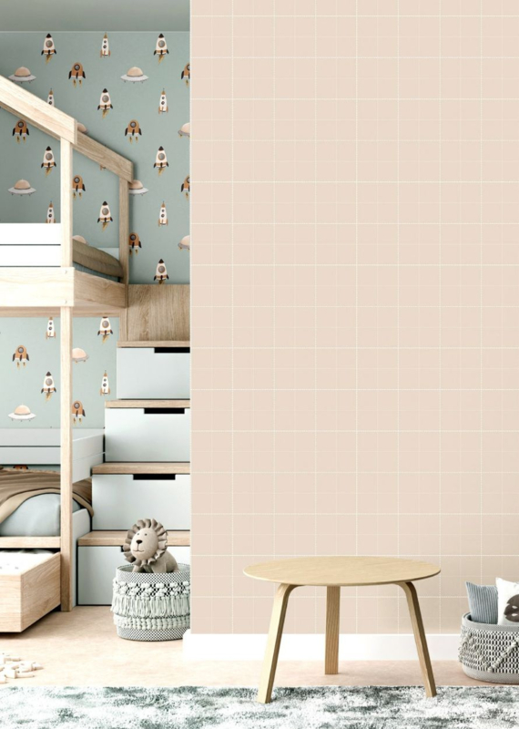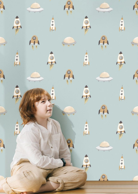 De subtiele patronen doen denken aan bewegende raketten en de uitgestrektheid van de ruimte, wat zorgt voor een avontuurlijke sfeer die perfect past in een kinderkamer. Dankzij de zachte, natuurlijke tinten en verfijnde contrasten blijft het geheel in balans: energiek en fantasierijk, maar toch rustig en harmonieus. Een ontwerp dat de fantasie prikkelt zonder te overheersen.
