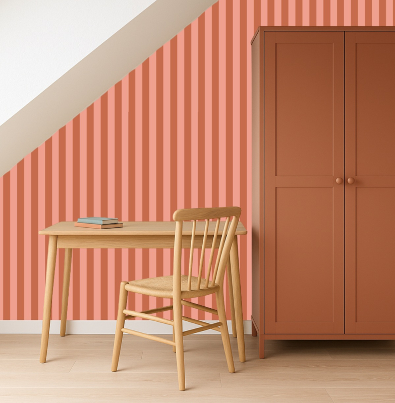 Geef je interieur een zonnige gloed met Terra Duo Lines. De twee harmonieuze tinten—terracotta en peach—lopen soepel naast elkaar en zorgen voor een kalme, natuurlijke uitstraling. Het voelt vriendelijk en modern tegelijk, alsof er altijd een streepje avondzon op je muur valt.