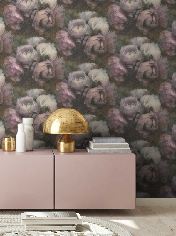 Vergrijsde mauve pioenrozen met een zachte, vintage uitstraling. Pioenwals Mauvemist geeft elke ruimte een warme, romantisch-verfijnde sfeer. Perfect voor slaapkamer, woonkamer of accentwand.