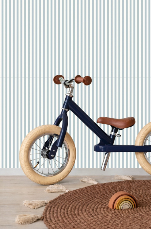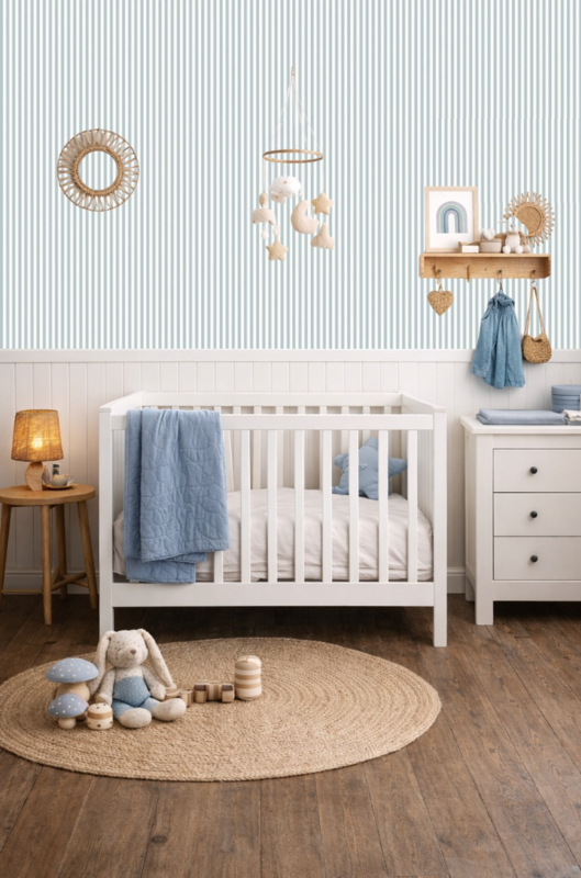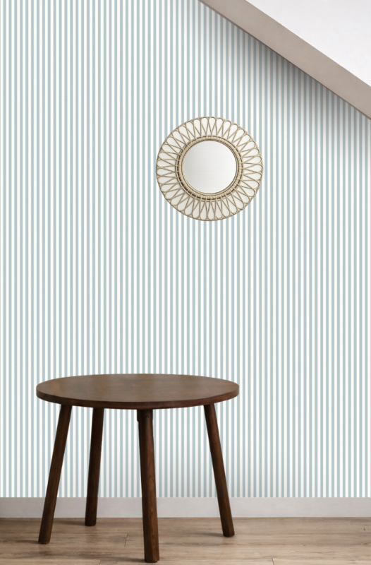 Riviera Blue Côte Stripes geeft elke ruimte direct een frisse, rustige uitstraling. De zachte blauwgrijze banen wisselen harmonieus af met een warme off-white tint, waardoor een sfeer van licht en sereniteit ontstaat. De klassieke verticale belijning, geïnspireerd op de Franse kust, brengt balans en verfijning zonder te overheersen.