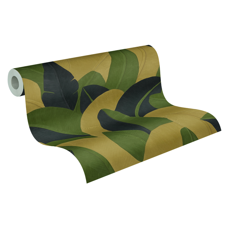 Golden Canopy 79039-1 is een krachtig samenspel van zwart, geel en groen. De grote, overlappende bladeren creëren een levendig en luxueus statement op de muur. Het contrast tussen diepe donkere tinten en warme gele accenten zorgt voor spanning en elegantie, terwijl het groen een natuurlijke balans toevoegt. Een uitgesproken dessin dat sfeer en karakter brengt zonder zijn verfijning te verliezen.