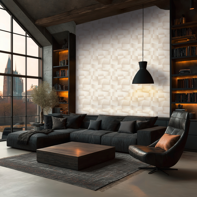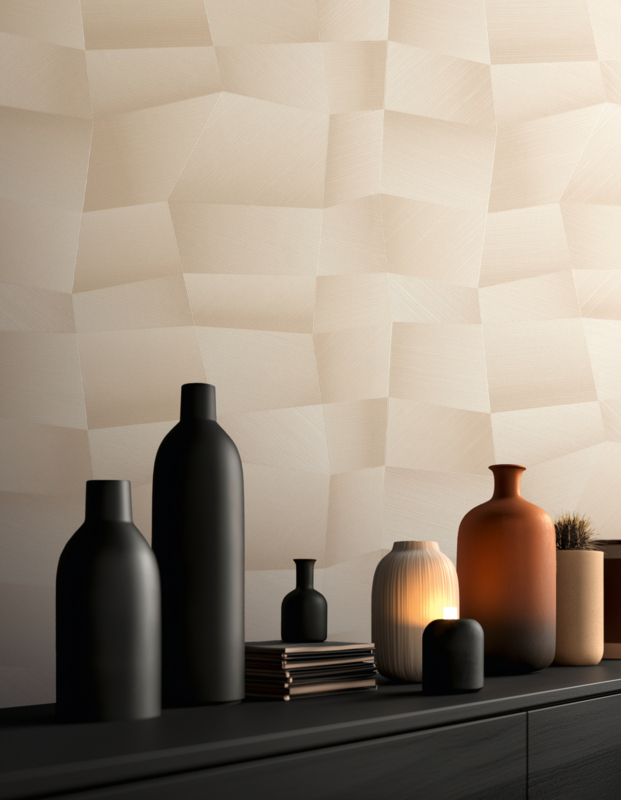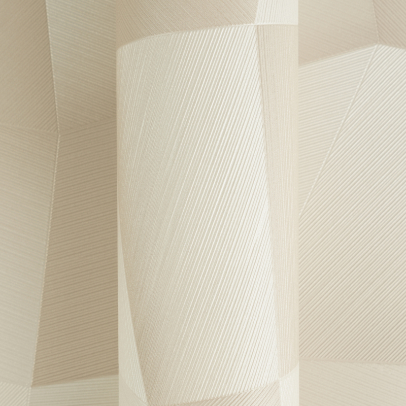 Behang 79197-4, in warme beige tinten, combineert een verfijnd geometrisch dessin met subtiele diepte en ritme. Het ontwerp is geïnspireerd op lichtverloop, architecturale schaduwen en zachte vouwpatronen, waardoor het oppervlak lijkt te ademen en met het licht verandert.