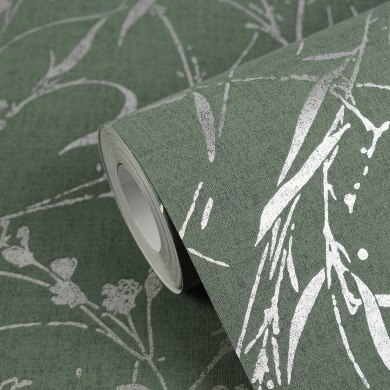 De linnen- en zijdeachtige structuur geeft een organisch, botanisch gevoel, zacht en vrouwelijk, terwijl subtiele zilveren accenten licht vangen en de wand een sprankelende diepte geven. Het ontwerp voelt poëtisch en rustig, maar vol levendigheid, perfect om een serene, stijlvolle statementwand te maken.