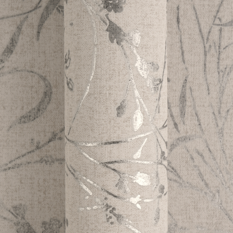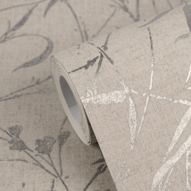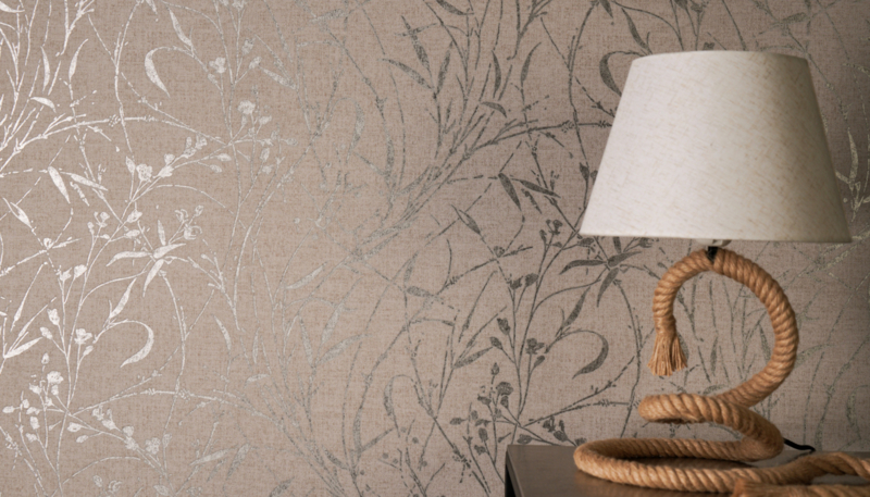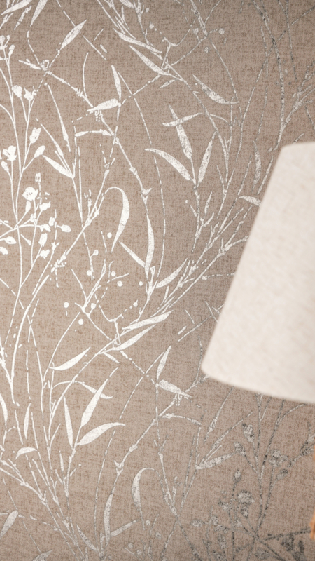 De linnen- en zijdeachtige structuur geeft de wand subtiele diepte en tactiliteit, terwijl de metallic zilvergrijze accenten het licht zacht vangen en een luxe uitstraling toevoegen. Perfect als elegante statementwand of als rustige, karaktervolle basiswand.