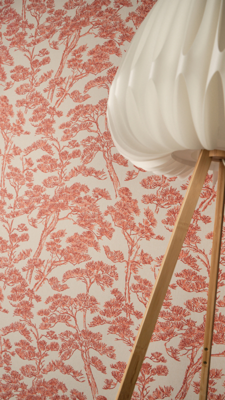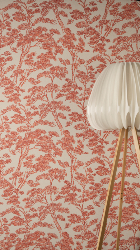 Behang 79001-4 uit de collectie Metropolitan Stories Vibes & Styles van Living Walls brengt de serene kracht van de natuur in je interieur. Het poëtische dennenboommotief op een beige achtergrond, gecombineerd met warme oranje en roestrode accenten, creëert een harmonieus en elegant geheel. Het subtiele reliëf geeft de wand tactiliteit en diepte, terwijl de aardse kleuren een meditatieve, rustgevende sfeer toevoegen.