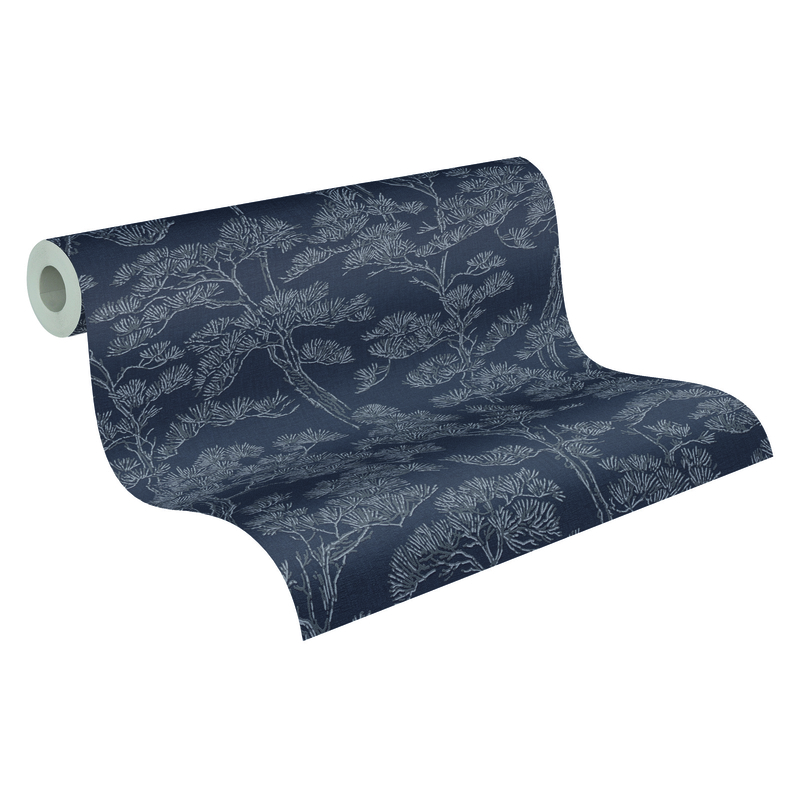 Behang 79001-1 uit de collectie Metropolitan Stories Vibes & Styles van Living Walls brengt een moderne en serene uitstraling in je interieur. Het Zen Branches-motief combineert donkerblauw en grijs in een elegant dennenboomdesign dat subtiele diepte en tactiliteit toevoegt. De contrasterende tinten creëren een stijlvolle, harmonieuze sfeer en maken iedere muur tot een karaktervolle blikvanger.