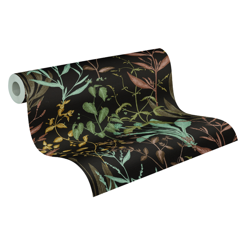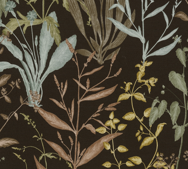 Maison Botanique 79009-4 combineert diep zwart met groen, warm geel en bruin tot een krachtig botanisch statement. Het dessin ademt Parijse charme: een subtiel verweerde look met rijke bladmotieven die doen denken aan zonlicht op oude gevels. De lichte structuur geeft het behang extra diepte, alsof het patroon is geweven uit tijd en herinnering.