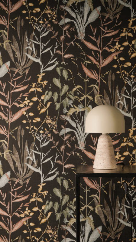 De donkere basis zorgt voor contrast en luxe, terwijl de natuurlijke tinten warmte en harmonie brengen. Perfect voor een uitgesproken accentwand in de woonkamer, eetkamer of slaapkamer waar karakter en elegantie samenkomen.