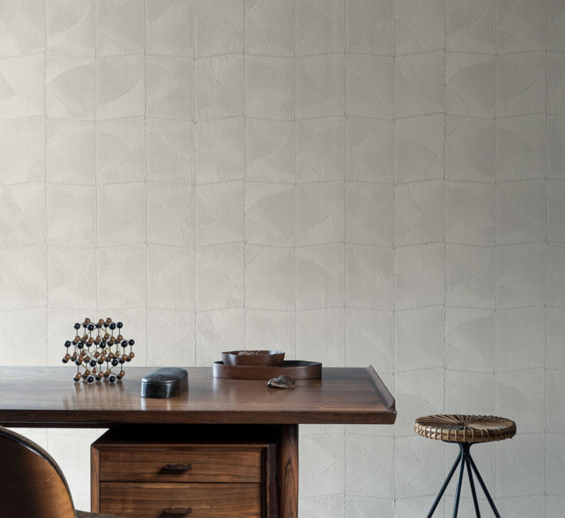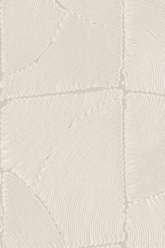 Behang met organische vormen. Handmatig plaatst men minutieus touw van verschillende materialen en diktes in patronen waardoor een minimalistische tekening met bijhorend reliëf ontstaat.