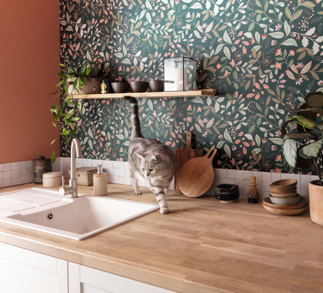 Een vleugje retro, razend trendy! Dit plantdessin is het meest emblematische van de collectie met zijn verfijnde lijnen, zijn poederachtige kleuren en zijn gouden accenten.
