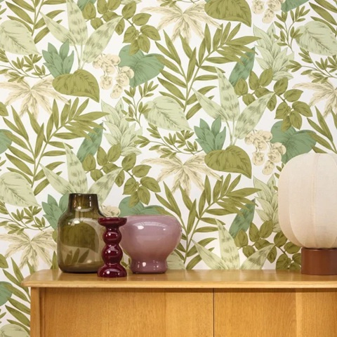 Het dessin heeft een speels en verfijnd karakter dat zorgt voor een levendig maar toch gebalanceerd geheel op de wand. De groene kleur brengt een natuurlijke dynamiek in de ruimte en geeft het interieur een frisse uitstraling.