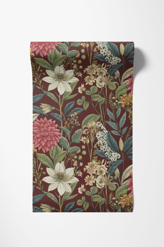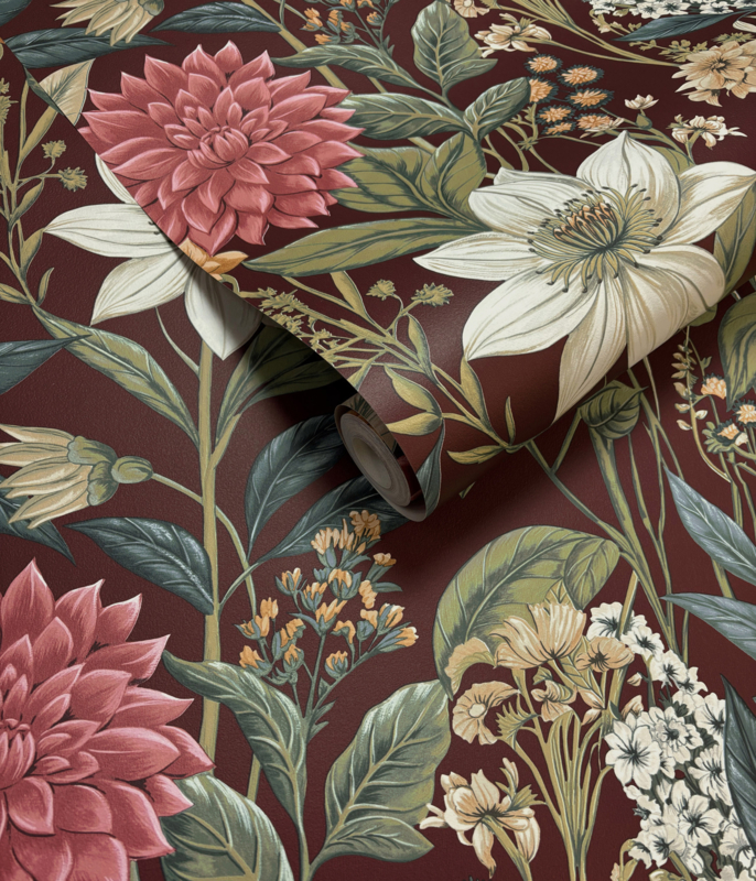 Dit dessin is bij uitstek geschikt als statement-accentwand in de woonkamer, slaapkamer of eetkamer. De diepe bordeaux achtergrond en het weelderige bloemenpatroon creëren een warme, cocooning sfeer.