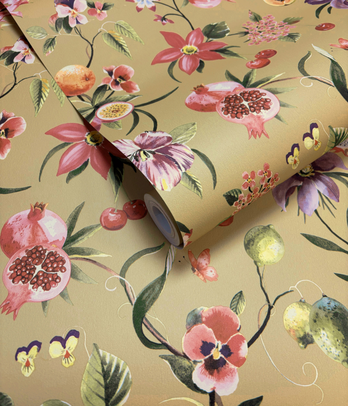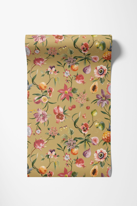 Tropica Ochre 92112 uit de Wanderlust-collectie van Dutch First Class is de keuze voor wie de overvloed van de tropen op een warme, goudgele achtergrond wil vangen. Het dessin toont hetzelfde weelderige spel van slingerende bloemen en exotische vruchten als de andere Tropica-varianten, maar de oker achtergrond geeft het geheel een rijke, zonnige uitstraling die direct warmte en energie brengt. Granaatappels, vijgen, ananassen, papaja's en kersen wisselen elkaar af tussen roze, paarse en lila bloemen, vlinders en rankend groen. De aquarelachtige schilderstijl geeft het geheel een luchtige kwaliteit, vol kleur en leven. Tropica Ochre transformeert een wand in een uitbundige tropische tuin waar natuur en kleur in perfecte harmonie samenkomen.