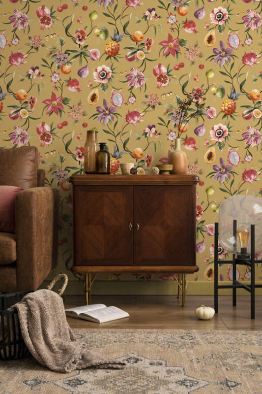 Dit dessin is bij uitstek geschikt als statement-accentwand in de woonkamer, eetkamer of keuken. De warme oker achtergrond en het kleurrijke patroon brengen direct energie en zuiderse warmte in de ruimte.