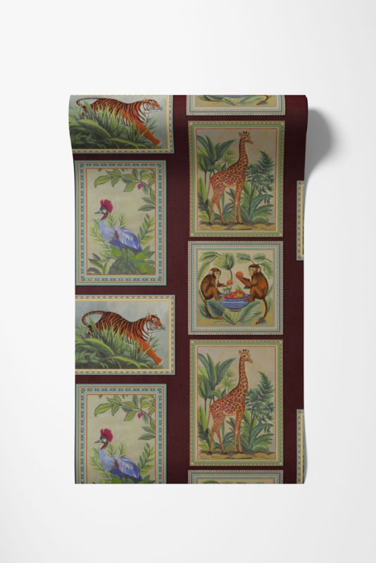 Menagerie Berry 92012 uit de Wanderlust-collectie van Dutch First Class is de keuze voor wie een verhaal op de muur wil. Het dessin toont een verzameling ingelijste dierenschilderingen op een diepe bordeaux achtergrond: een sluipende tijger tussen tropisch groen, een statige giraf tussen varens, spelende apen met een fruitmand en een kroonkraan tussen weelderig bladeren. Elk kader is omgeven door sierlijke ornamenten in blauw, terra en beige, als botanische prenten uit een reizigersstudie. De geschilderde stijl heeft de warmte van verouderde pigmenten, vol karakter en geschiedenis. Menagerie transformeert een wand in een verfijnde galerij van wonderen.