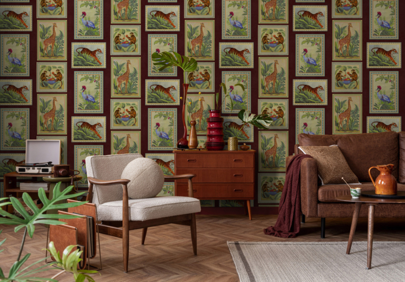 Dit dessin is bij uitstek geschikt als statement-accentwand in de woonkamer, eetkamer of studeerkamer. De diepe bordeaux achtergrond en de rijke dierenschilderingen creëren een warme, dramatische sfeer vol karakter.