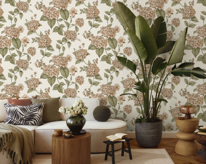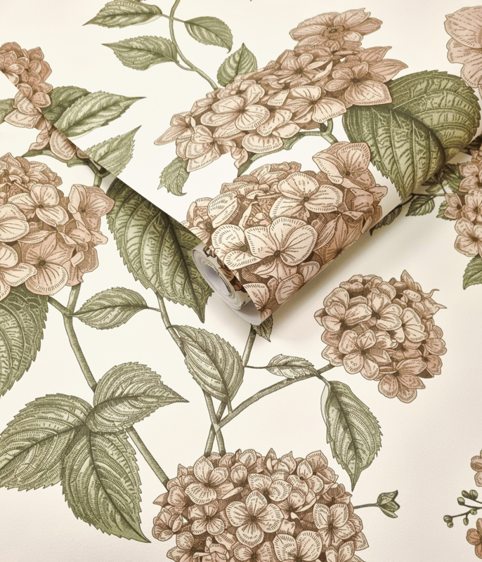 Hortensia Coral Green 92120 uit de Wanderlust-collectie van Dutch First Class is de keuze voor wie botanische verfijning op de muur wil. Het dessin toont grote hortensiabollen in zacht terra en poederroze, getekend in een gedetailleerde lijnstijl die doet denken aan klassieke botanische illustraties. Donkergroene bladeren op sierlijke stengels omgeven de bloemen en geven het geheel diepte en contrast op een warme crème achtergrond. De compositie ademt rust en tijdloosheid. Hortensia geeft een wand botanische grandeur zonder drama, verfijnd en vol stille schoonheid.