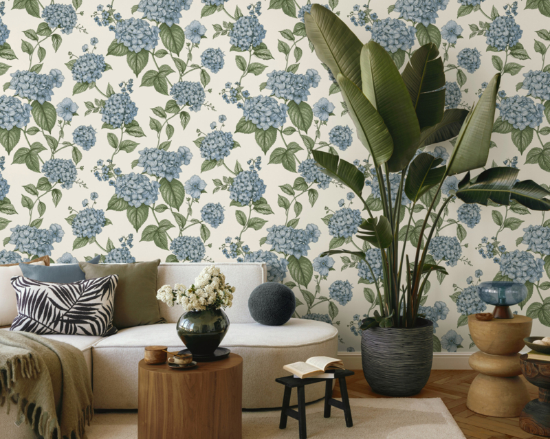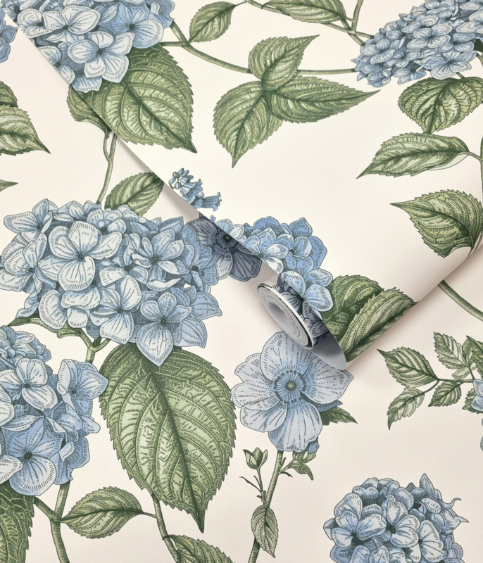 Hortensia Blue Green 92121 uit de Wanderlust-collectie van Dutch First Class is de keuze voor wie botanische verfijning op de muur wil in een frisse, klassieke kleurencombinatie. Het dessin toont grote hortensiabollen in zacht staalblauw en lichtblauw, getekend in een gedetailleerde lijnstijl die doet denken aan klassieke botanische illustraties. Donkergroene bladeren op sierlijke stengels omgeven de bloemen en geven het geheel diepte en contrast op een warme crème achtergrond. De combinatie van blauw en groen ademt rust en tijdloosheid. Hortensia Blue Green geeft een wand botanische grandeur zonder drama, fris en vol stille schoonheid.