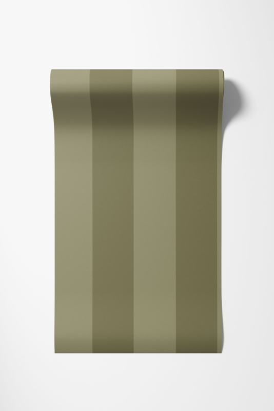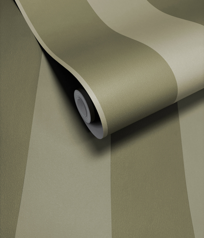 • Grootschalig toon-op-toon strependessin in gedempte olijfgroene tinten voor een warme, aardse wandbeleving