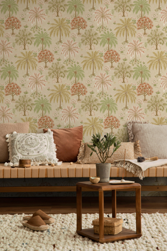 Dit dessin is veelzijdig inzetbaar als accentwand in woonkamer, slaapkamer of eetkamer. De warme beige achtergrond en het gedempte kleurenpalet creëren een serene, naturale sfeer die in elk interieur past.