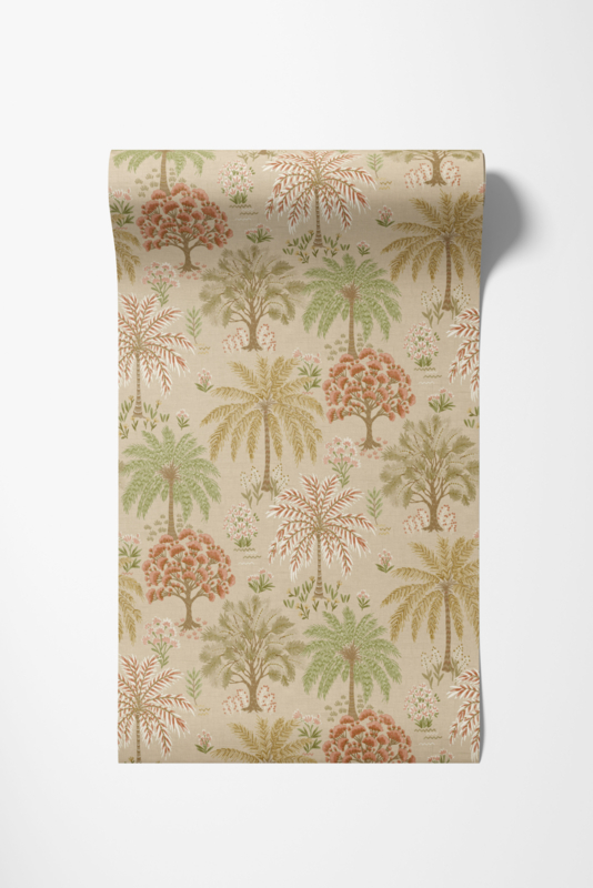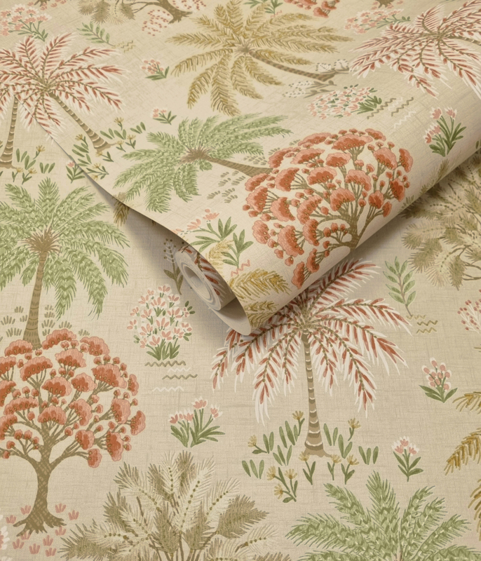 Solana Coral Beige 92030 uit de Wanderlust-collectie van Dutch First Class is de keuze voor wie de weelde van de tropen op een lichte, naturale achtergrond wil vangen. Het dessin toont een weids tropisch bos van wuivende palmen, bloeiende bomen en gelaagd gebladerte in oudroze, groen en oker op een warme beige achtergrond met een subtiele linnentextuur. De illustratieve stijl heeft iets van een handgetekende botanische tekening, verfijnd en vol leven tegelijk. Het gedempte, naturale kleurenpalet maakt Solana Coral Beige de meest veelzijdige variant uit de collectie. Solana transformeert een wand in een sereen tropisch landschap dat rust uitstraalt en de verbeelding prikkelt.
