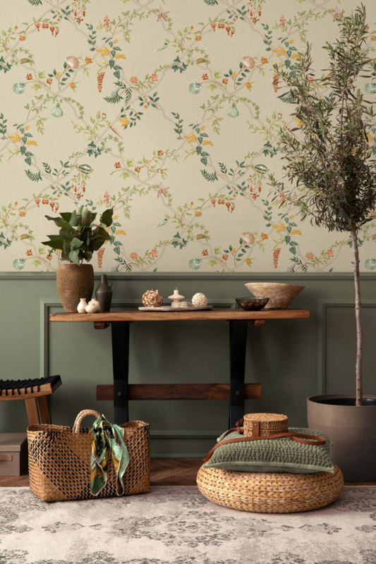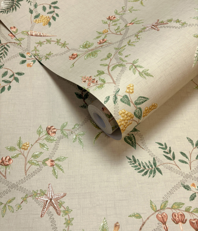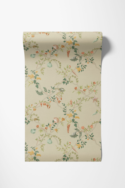 Marina Coral Beige Green 92072 uit de Wanderlust-collectie van Dutch First Class is de keuze voor wie kustelegantie op een lichte, naturale achtergrond wil. Het dessin toont hetzelfde sierlijke bloementrellis van rankende takken met kleine bloesems als de andere Marina-varianten, maar nu in een warme mix van groen, terra, geel en aqua op een zachte beige achtergrond met een subtiele linnentextuur. Zeeschelpen, zeesterren en slakkenhuizen verschijnen als verstopte schatten tussen het gebladerte. De lichte achtergrond en het naturale kleurenpalet geven dit dessin een frisse, zonnige uitstraling. Marina Coral Beige Green brengt de sfeer van een zonnige kusttuin naar binnen, warm en vol kleine ontdekkingen.