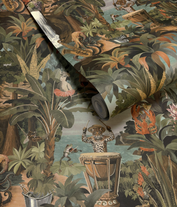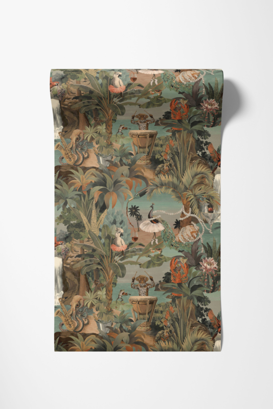 Sunset Carnival Aqua Coral 92092 uit de Wanderlust-collectie van Dutch First Class is de keuze voor wie hetzelfde uitbundige tropische feest wil als de andere Sunset Carnival-varianten, maar in een frisser, naturaler kleurenpalet. Op een gedempte aqua en grijsgroene achtergrond speelt hetzelfde cast van karakters zich af: een luipaard op trommel, een kaketoe met wijnglas, een pauw in tutu, een octopus met saxofoon en een kreeft tussen bloemen. Terra, oker en koraalrode accenten geven het dessin warmte en diepte. De compositie voelt speels en zorgvuldig opgebouwd tegelijk, vol ritme en verhaal. Sunset Carnival Aqua Coral transformeert een wand in een zomers tropisch feest vol fantasie en verfijning.