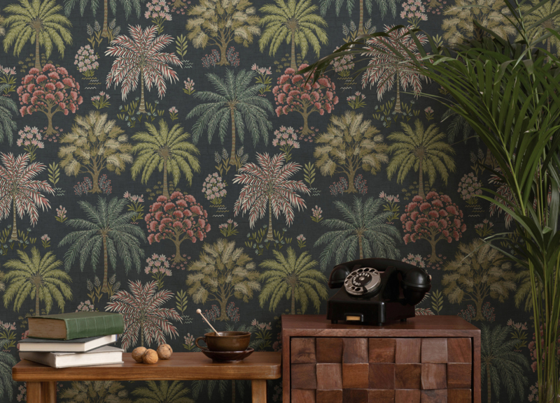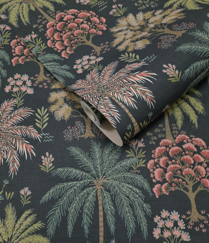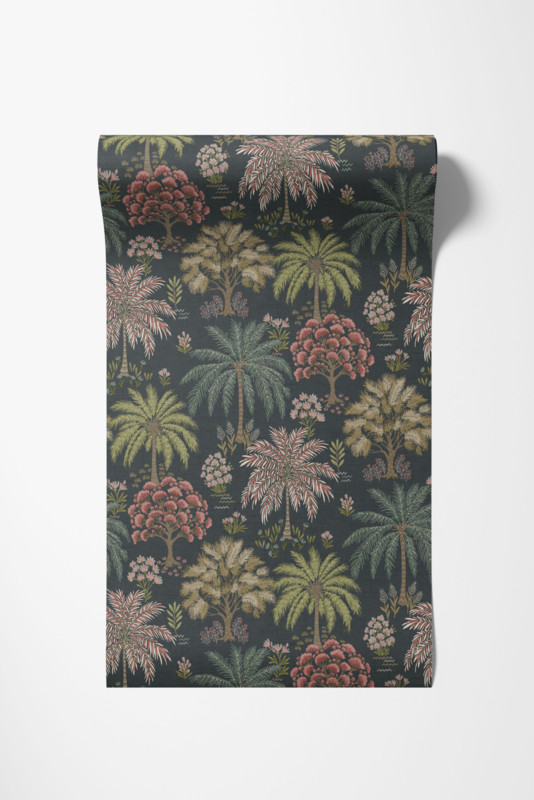 Solana Navy 92031 uit de Wanderlust-collectie van Dutch First Class is de keuze voor wie de weelde van de tropen naar binnen haalt. Het dessin toont een weids tropisch bos van wuivende palmen, bloeiende bomen en gelaagd gebladerte in groene, roze en taupe tinten op een diepe, donkere achtergrond. De illustratieve stijl heeft iets van een handgetekende botanische tekening, verfijnd en vol leven tegelijk. Solana transformeert een wand in een sereen tropisch landschap dat rust uitstraalt en de verbeelding prikkelt.