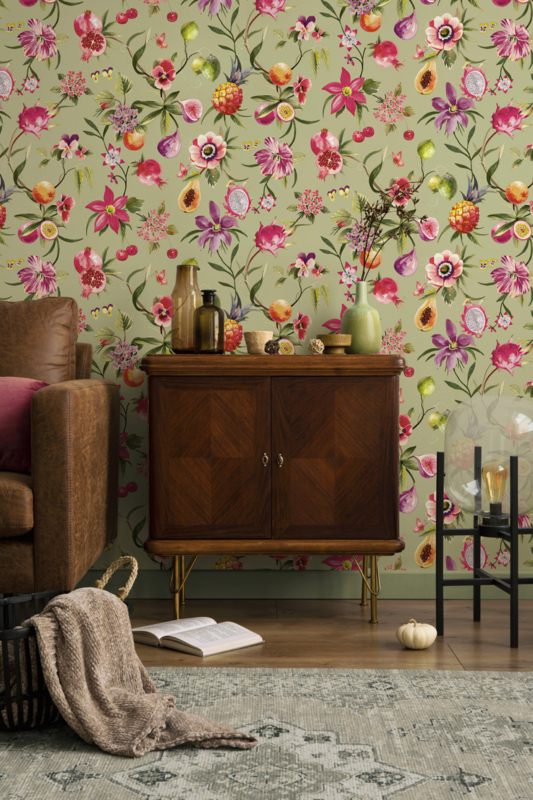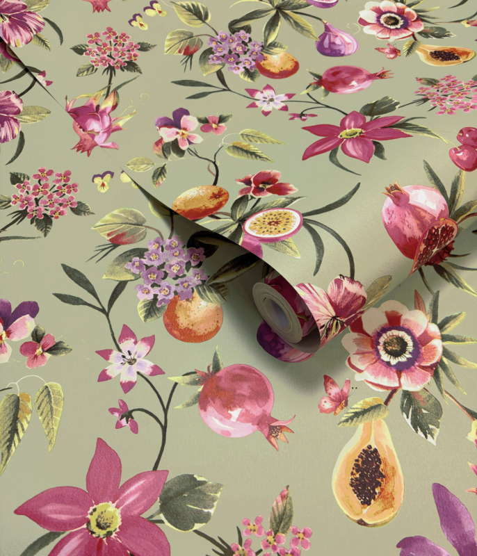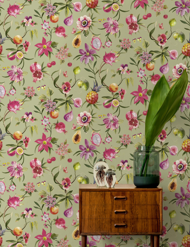 Tropica Sage 92110 uit de Wanderlust-collectie van Dutch First Class is de keuze voor wie de overvloed van de tropen op de muur wil vangen. Het dessin toont een weelderig spel van slingerende bloemen en exotische vruchten op een zachte saliegroen achtergrond. Granaatappels, vijgen, ananassen, papaja's en kersen wisselen elkaar af tussen roze, paarse en lila bloemen, vlinders en rankend groen. De aquarelachtige schilderstijl geeft het geheel een luchtige, speelse kwaliteit, vol kleur en leven. Tropica transformeert een wand in een zonnige tropische tuin waar natuur en kleur in perfecte harmonie samenkomen.