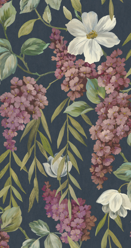 Buddleia Navy 99550 uit de Wanderlust-collectie van Dutch First Class is de keuze voor wie een botanische tuin op grootse schaal op de muur wil. Het dessin toont hangende trossen vlinderstruikbloesem in roze en mauve, afgewisseld met grote crème bloemen en sierlijke bladeren op een diepe navy achtergrond. De geschilderde stijl is expressief en weelderig, met een zachte beweging die aan een tuin in volle bloei doet denken. Buddleia combineert dramatische diepte met botanische gratie, verfijnd genoeg voor elk premium interieur.