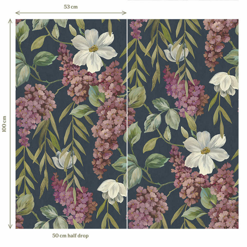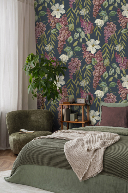 Dit dessin is bij uitstek geschikt als statement-accentwand in de woonkamer, slaapkamer of eetkamer. De diepe navy achtergrond en het weelderige bloemenpatroon creëren een warme, cocooning sfeer.