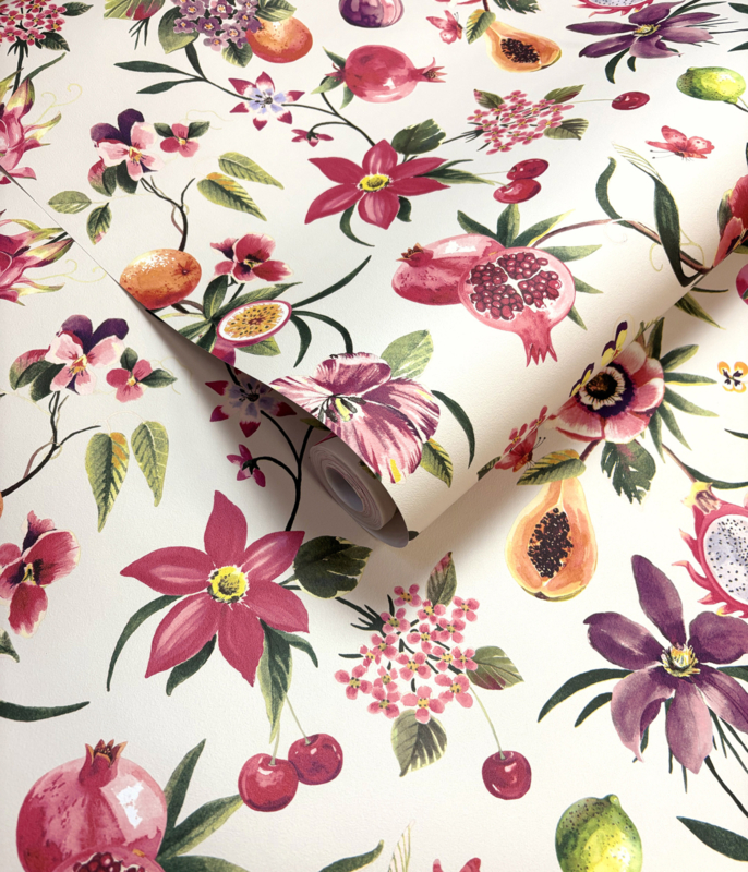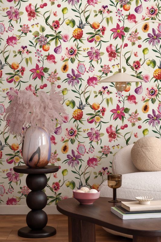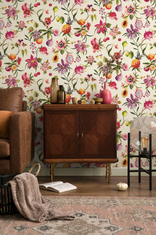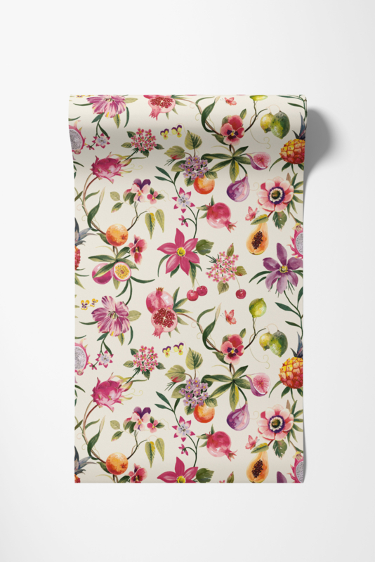 Tropica Cream Multi 92111 uit de Wanderlust-collectie van Dutch First Class is de keuze voor wie de overvloed van de tropen op een lichte, frisse achtergrond wil vangen. Het dessin toont hetzelfde weelderige spel van slingerende bloemen en exotische vruchten als de saliegroen variant, maar nu op een warme crème achtergrond die het kleurenpalet volop laat stralen. Granaatappels, vijgen, ananassen, papaja's en kersen wisselen elkaar af tussen roze, paarse en lila bloemen, vlinders en rankend groen. De aquarelachtige schilderstijl geeft het geheel een luchtige, zonnige kwaliteit, vol kleur en leven. Tropica transformeert een wand in een uitbundige tropische tuin waar natuur en kleur in perfecte harmonie samenkomen.