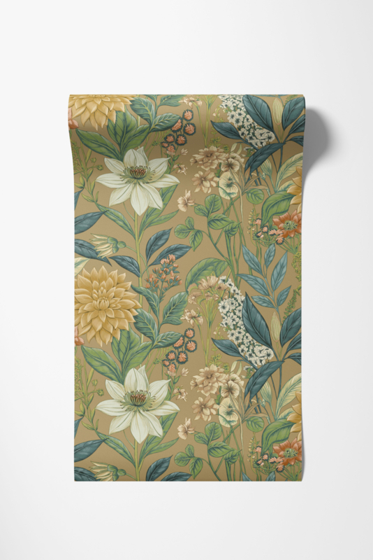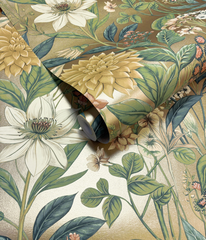 Clematis Gold 92060 uit de Wanderlust-collectie van Dutch First Class is de keuze voor wie botanische grandeur op een warme, goudkleurige achtergrond wil. Het dessin toont grote, weelderige bloemen in gebroken wit, beige en goud op een rijke goudkleurige achtergrond met een subtiele metallic glans. Dahlia's, clematissen en vlierbloesem wisselen elkaar af tussen blauwgroene en groene bladeren en sierlijke stengels, gelaagd en vol beweging. De botanische stijl is verfijnd en expressief, romantisch zonder sentimenteel te zijn. De Metallic Shine-afwerking laat het goud oplichten afhankelijk van de lichtinval. Clematis Gold geeft een wand drama en diepte, warm en weelderig tegelijk.