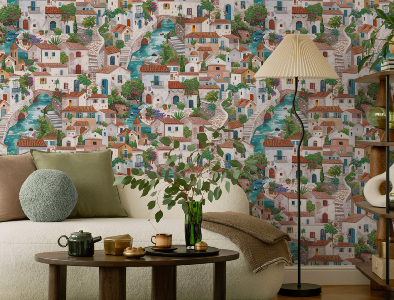 Foto's doen dit behang geen recht. Bezoek onze winkel regio Rotterdam en ontdek zelf hoeveel verhalen dit Italiaanse dorpstafereel verbergt. Onze specialisten staan klaar met persoonlijk advies van staalkeuzе tot plaatsing.