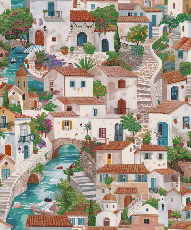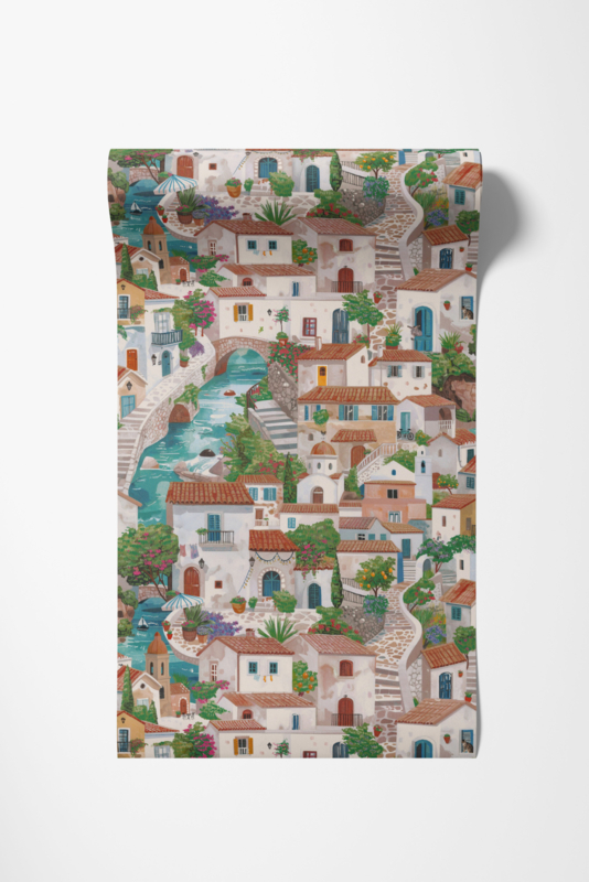 Monteroso Multi 92020 uit de Wanderlust-collectie van Dutch First Class is de keuze voor wie de tijdloze charme van de Italiaanse kust op de muur wil. Het dessin toont een weelderig Mediterraan dorpstafereel: terracotta daken, blauwe luiken, zongerijpte stenen gevels, bougainvillea, citroenboompjes en steegjes die kronkelen langs kanalen en stenen bruggetjes. Verstopt in het dessin verschijnen een ezel in een deuropening, een kat op een vensterbank en een fiets tegen een muur. De geschilderde stijl is warm en nostalgisch, vol leven en poëzie. Monteroso transformeert een wand in een zonnige Italiaanse reverie, verfijnd en vol de rustige cadans van het mediterrane leven.