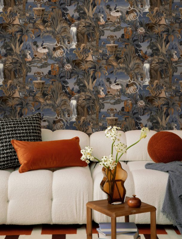 Dit dessin is bij uitstek geschikt als statement-accentwand in de woonkamer, eetkamer of entree. Het donkere kleurenpalet en de rijke detaillering maken van elke ruimte een dramatische, onverwachte blikvanger.