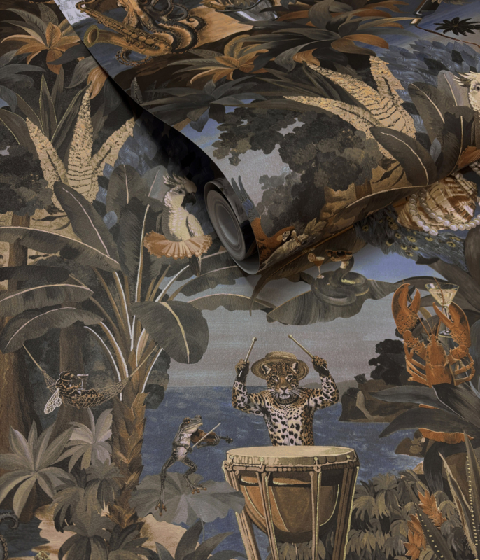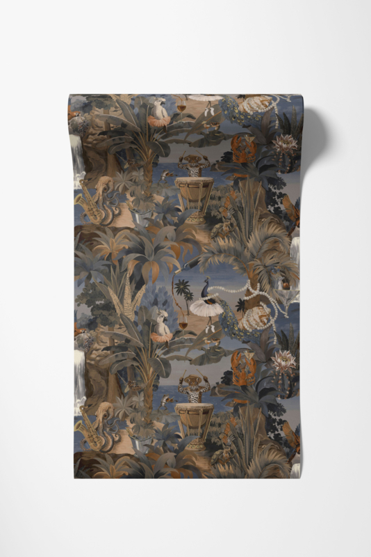 Sunset Carnival Navy 92091 uit de Wanderlust-collectie van Dutch First Class is de keuze voor wie hetzelfde uitbundige tropische feest wil als de Multi-variant, maar in een gedempter, moodier kleurenpalet. Op een diepe navy en grijsblauw achtergrond speelt hetzelfde cast van karakters zich af: een luipaard op trommel, een kaketoe met wijnglas, een pauw in tutu, een octopus met saxofoon en een kreeft tussen bloemen. De warme terra en goudbruine accenten geven het donkere dessin gloed en diepte. De compositie voelt speels en zorgvuldig opgebouwd tegelijk, vol ritme en verhaal. Sunset Carnival Navy transformeert een wand in een nachtelijk tropisch feest vol fantasie en verfijning.